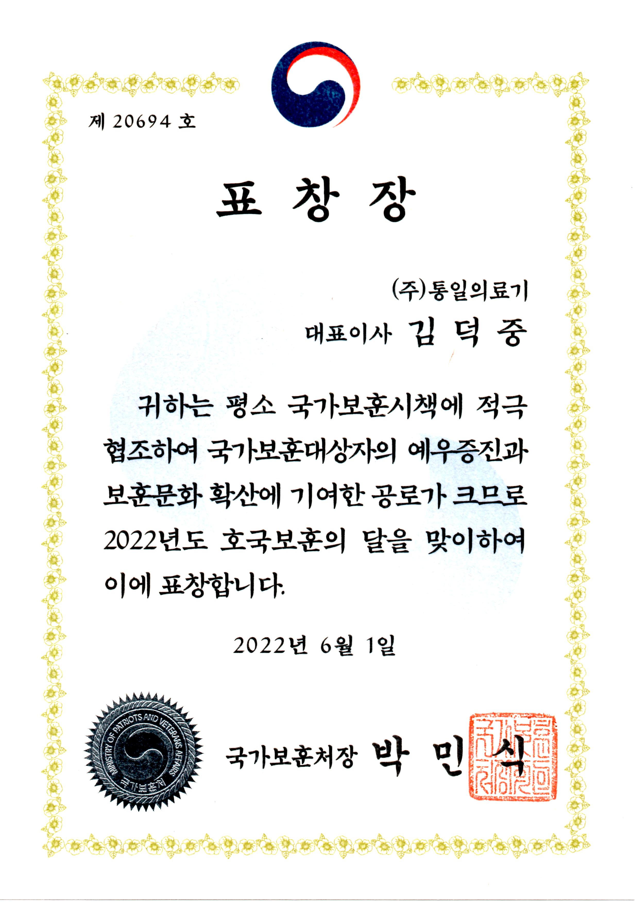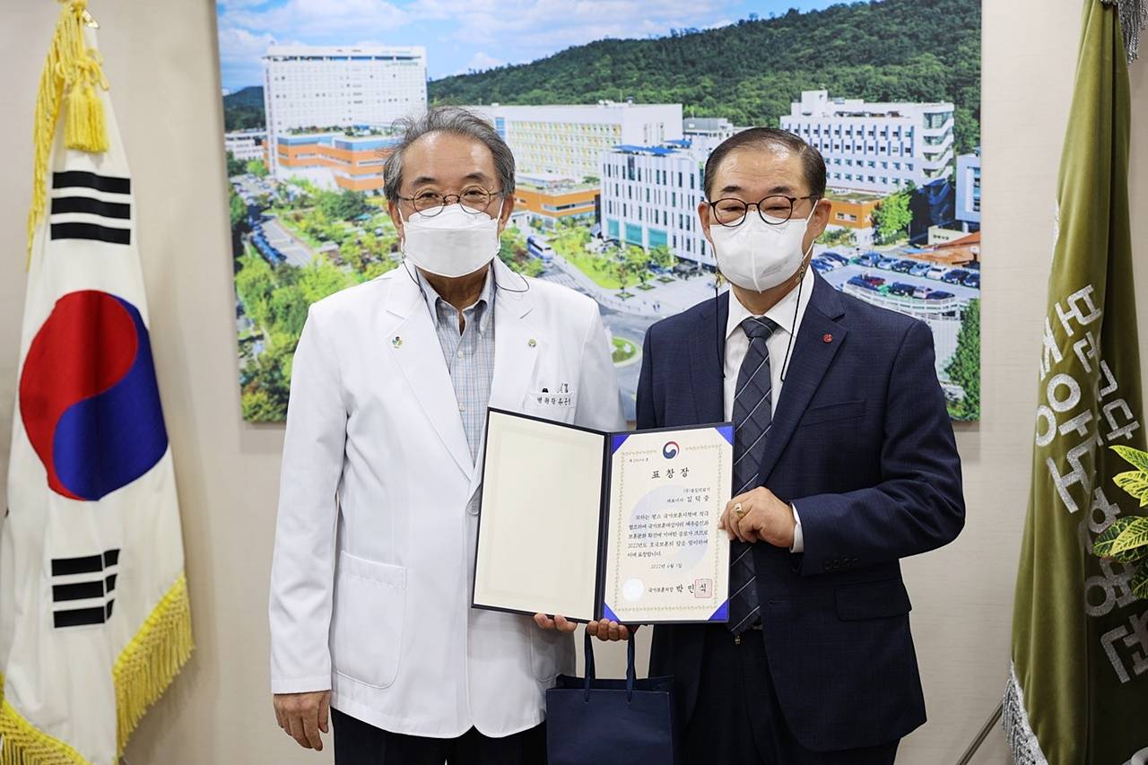 CEO Kim, Deuk-Joong is receiving an award certificate from Yoo Geun-Young, The Head of the Central Veterans Hospital.