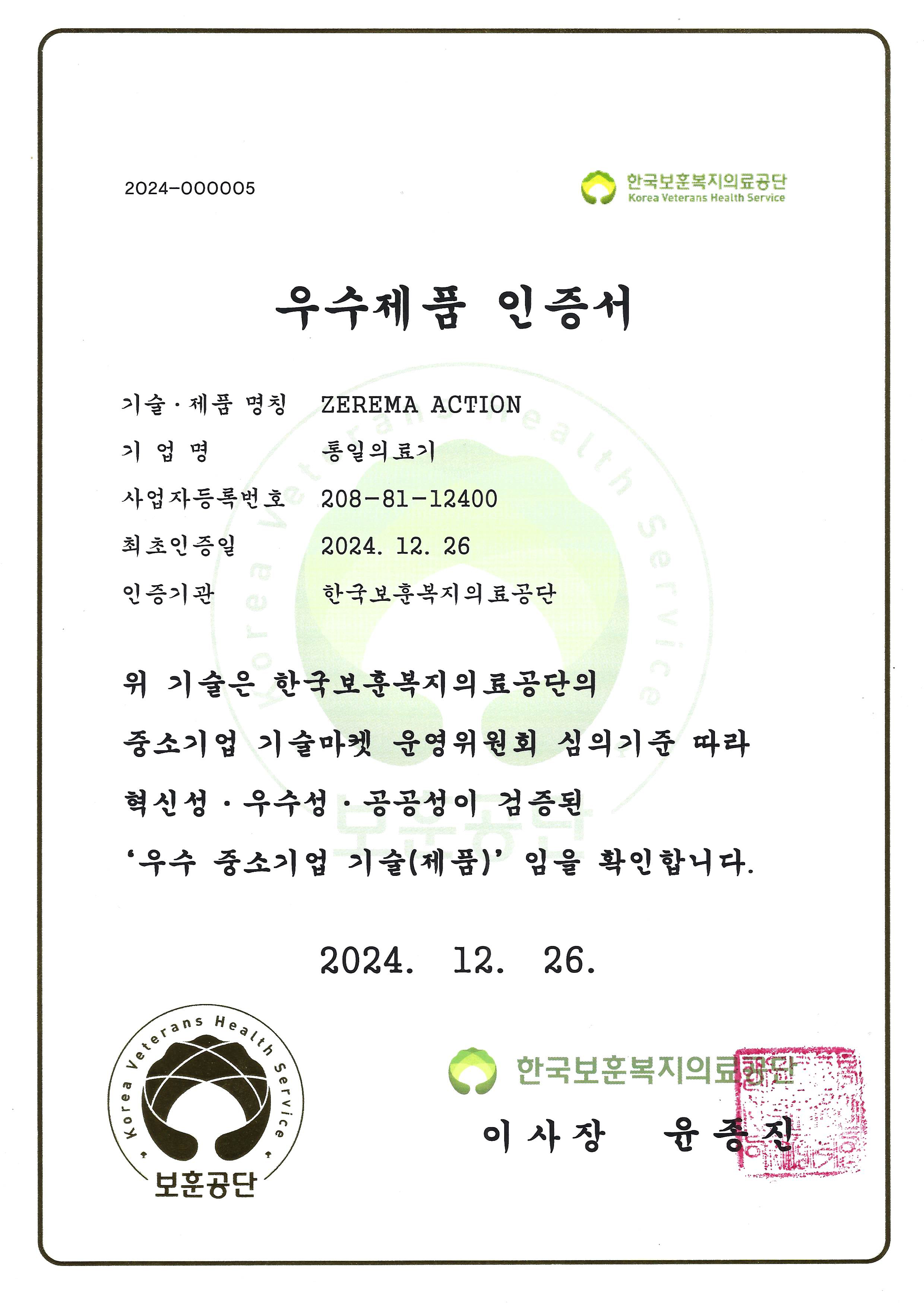 "Zerema Action, a smart pillow developed by Tongil Medical Co., Ltd. for better sleep, has received certification from the Korea Veterans Welfare and Medical Service (Chairman Yoon Jong-jin) as an excellent small and medium-sized enterprise technology (product) verified for its innovation, excellence, and public value. This pillow detects snoring and controls the height of the air pockets inside the pillow to alleviate snoring, while also improving sleep quality."