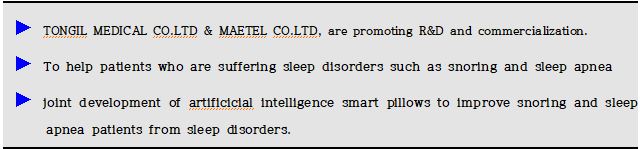 MAETEL&TONGIL,as an agreement organization, will charge of sleep montoring, R&D of production & supply, market development and sales.